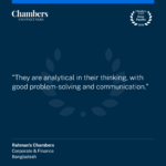 Rahman’s Chambers, from its very inception, has not only been assisting clients in different corporate transactions but also helping them for over a decade, in fulfilling their requirements by filling litigation in company court or bankruptcy court. In the company court, under high court division, we have successfully handled a number of major company matters suits are e.g. merger and amalgamation of one company with another, winding -up of a company by the creditor, monitory protection suit, etc. We have experience of assisting clients over bankruptcy matters. Chambers and Partners 2026 Asia Pacific Guide ranked Rahman’s Chambers for Corporate & Finance with its 2023 Editorial stating: Advocates at the firm are knowledgeable on restructuring and insolvency procedures. They added: “One source states: ‘Their solution-based and customer-oriented approach is enormously helpful in reaching the best solution.”